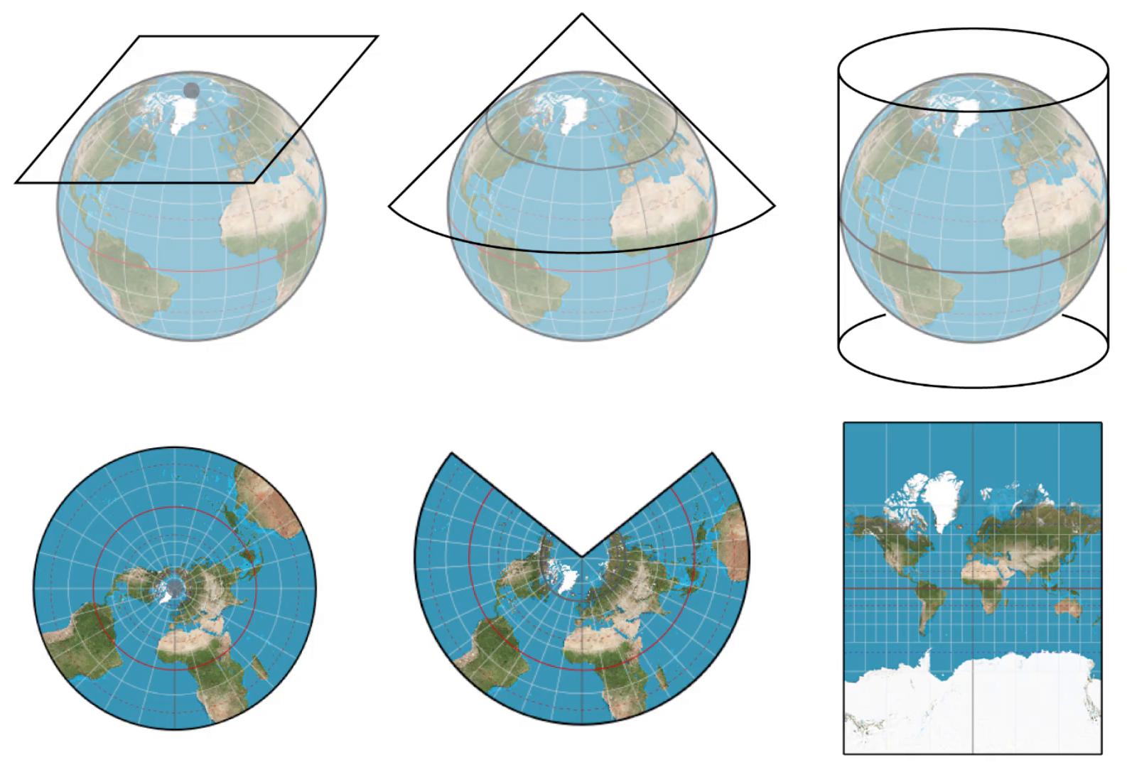 Par la suite, nous entendrons par “données spatiales” l’ensemble des données qui portent sur les caractéristiques géographiques des objets (localisation, contours, liens). Les caractéristiques géographiques des objets sont décrites à l’aide d’un système de coordonnées. Celles-ci permettent de représenter l’objet géographique dans un espace euclidien à deux dimensions \((x,y)\). Le passage de l’espace réel (la Terre, qui est une sphère en trois dimensions) à l’espace plan se fait grâce à un système de projection.