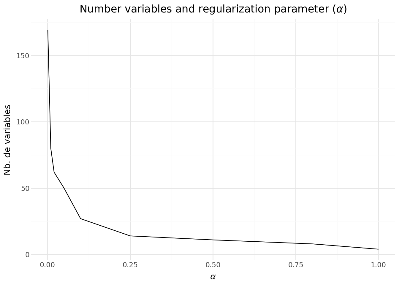 où \(\lambda\) est une réécriture de la régularisation précédente qui dépend de \(\alpha\). La force de la pénalité appliquée aux modèles non parcimonieux dépend de ce paramètre.