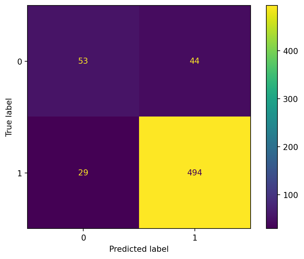 This shows us that we were not so far off from the optimal parameter when we arbitrarily chose max_depth=4. It is already a little better when we look at the confusion matrix, but we are still working with a model that overpredicts the dominant class.