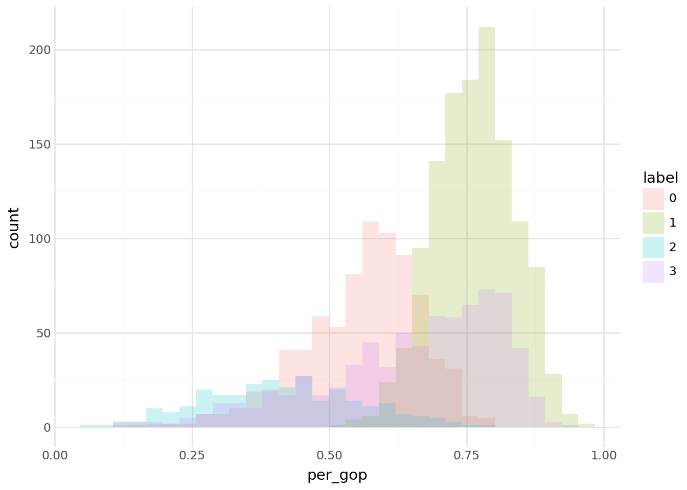 df2 = votes.loc[:, xvars + ["per_gop"]]- Perform a k-means with \(k=4\).