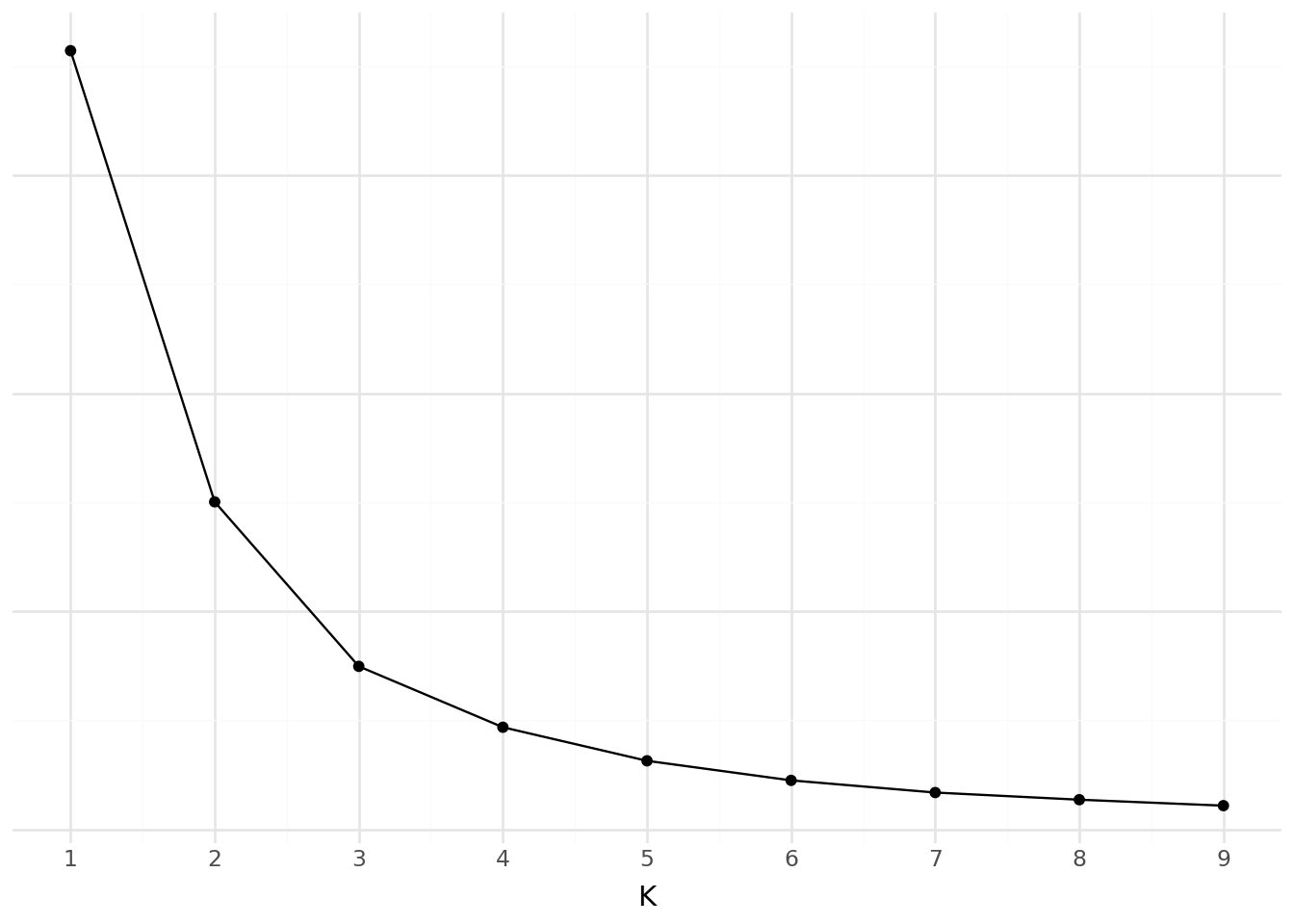 Elbow method: We take the inflection point of the model performance curve. This corresponds to the moment when adding an additional cluster, which increases model complexity, brings only modest gains in modeling the data.
